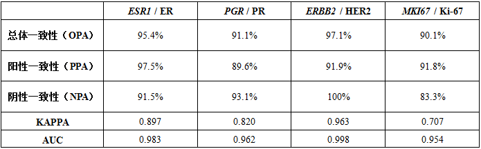 ESR1 / ER, PGR / PR:妈妈泰谱和IHC对于ESR1 / ER的判断总体一致性(OPA)超过95%,而两者对于PGR / PR的判断一致性相对较低,但OPA也有90%以上;