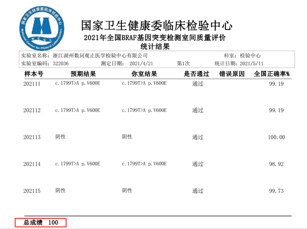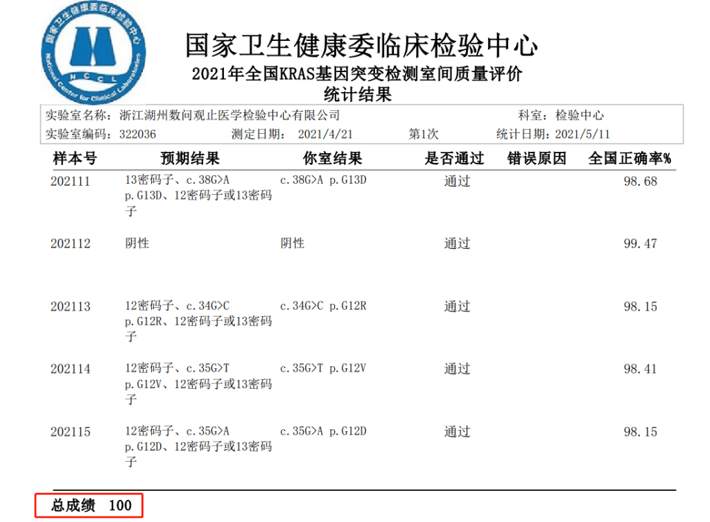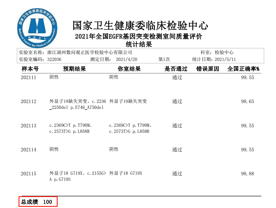 近日,国家卫生健康委临床检验中心(NCCL)公布了2021年第一次全国临床检验室间质量评价(EQA)结果。数问观止医学检验中心参评项目EGFR、EML4-ALK、BRAF及KRAS检测全部满分通过。