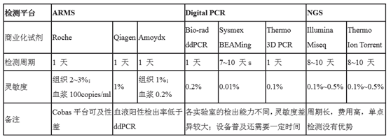 血液中ctDNA丰度低、片段小的特性对检测平台提出了较高要求,需要敏感度较高的方法进行检测。目前市场上主流ARMS方法的检测阈值达1%,远不能满足液态活检的要求。其中罗氏EGFR突变检测试剂盒(Cobas平台)是奥希替尼临床注册研究患者入组所采用的T790M检测方法,但该平台对血液样本的检出率不高,一代TKI耐药后NSCLC患者的T790M阳性检出率仅为27%。对于灵敏度较高的数字PCR平台,其检测阈值可达0.1-0.01%,不同数字PCR平台T790M阳性检出率约28-60%。对于NGS,不同实验室采用不同平台、操作规程、测序深度以及生物信息学判读标准,可导致检测血液中T790M的阳性率有所差别,研究报道在16.8%~54.0%。在保证一定的测序覆盖深度下,NGS血液检测敏感度得到一定程度提升和保证,可用于ctDNA中T790M检测。但由于其价格较高,在单点检测上并没有优势。