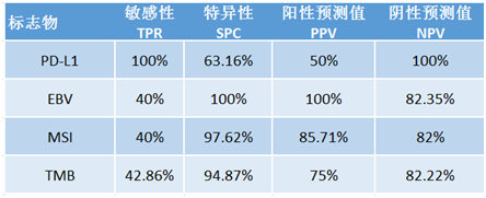 一篇来自韩国研究者发表在Nature Medicine上的文章,比较了PD-L1、MSI、TMB、EBV 4个标志物对PD-L1抑制剂药物在胃癌中的疗效预测,结果显示PD-L1的总体得分优于MSI和TMB,其敏感性和阴性预测值均达到100%。PD-L1的阴性预测值100%意味着预测阴性的患者药物完全无效,没有错过任何一个可能获益的患者。而其余3个标志物的敏感性均为40%左右且阴性预测值82%左右,意味着有一些其实有效的患者被误判为阴性,失去治疗机会。在上述MSI、TMB和EBV疗效预测中,PD-L1是一个领先且优秀均衡的方法。