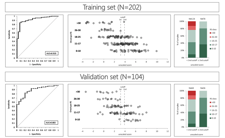 在SABCS壁报P2-07-08的研究中,研究者首先以训练组202例患者妈妈泰谱和Oncotype DX的检测数据为基础,通过多变量逻辑回归分析,建立了妈妈泰谱对于Oncotype DX评分低危患者【即RS评分≤25(TAILORx研究表明,对于此类患者,化疗没有无病生存和总生存均的明显获益)】的预测模型(AUC=0.920),并在敏感性为95%和100%处设置两个临界值。