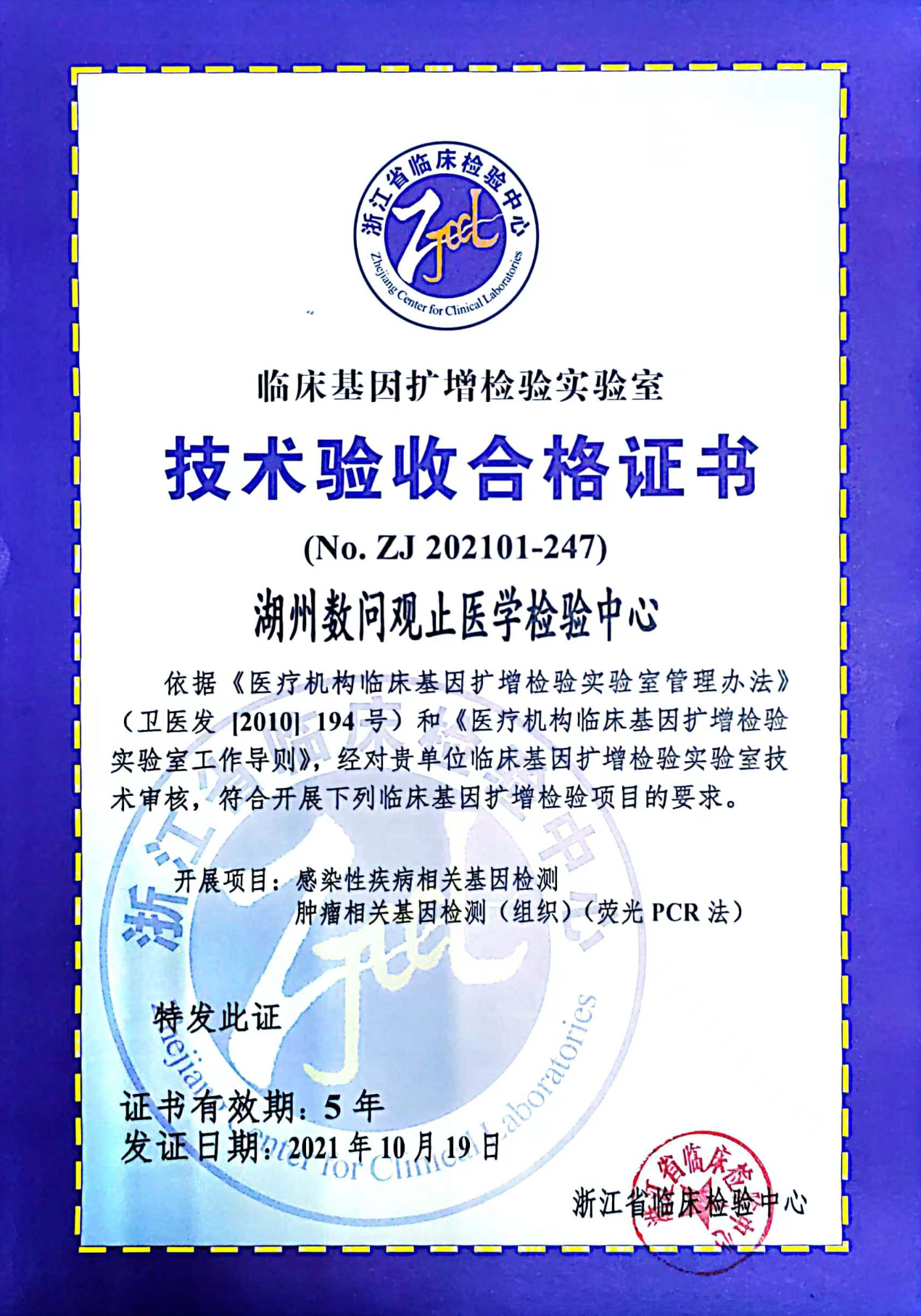 数问观止医学检验中心成立于2014年,为数问生物旗下第三方医学检验中心。中心已获得美国CAP认证、国内NCCL高通量测序检测室间质等多次多项认可,并且通过ISO13485质量管理体系认证,符合质量要求ISO15189体系。