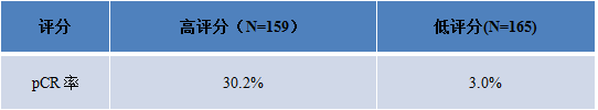 收集TECHNO和PREPARE新辅研究中的活检样本共418例,其中肿瘤分期为cT1-2的样本共324例。分别进行妈妈泰谱® 检测并进行pCR评分计算,≤41分为低评分,预示患者接受新辅助化疗获得pCR可能性较低;≥42分为高评分,预示其获得pCR可能性较高。