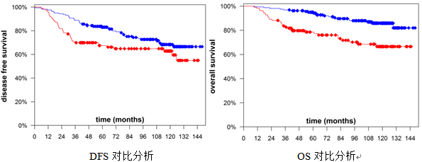 对于新辅助化疗没有取得pCR的324例患者,研究者进一步分析发现,与妈妈泰谱® pCR低评分(N=160,图中蓝线)相比,妈妈泰谱pCR高评分患者(N=110,图中红线)无病生存期(DFS)和总生存期(OS)均显著较差(DFS: HR=1.59, p=0.032; OS: HR=2.85, p < 0.001)。